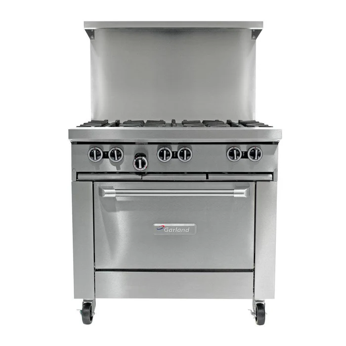 The Garland Starfire Pro Series Restaurant Range is designed for high-performance in busy commercial kitchens. Powered by LP gas, this 36-inch range offers six open burners and a standard oven, making it an essential tool for any professional kitchen.